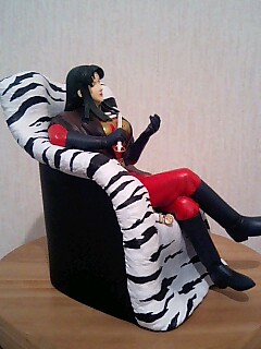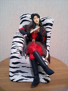 全体的な作りは、ポピーの完成品の中ではまずまずですが、いかんせん、服の中に人体が入っている、という実感が足りないんですよね。特に脚部の造型。棒で芯を作って、その上にただ肉付けして作った、というのが見え見えで萎えます。でも、シーマ様の必須アイテム、虎柄イスと一緒に立体化した点は高評価。